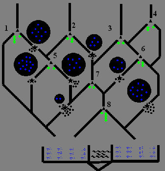 Bei Verteilerventil 7 treffen sich 9 Liter und 5 Liter, was zusammen 14 Liter macht. 7 davon fließenzu einem Schließmechanismus, in dem sie gefangen bleiben, andere 7 Liter fließen zu Ventil 8.