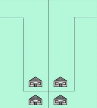 Dieses Bild soll so geteilt werden, dass alle Häuser in einer gleich großen Fläche stehen. Beschreibe die Schnitte bitte möglichst exakt aber nur so ausführlich wie nötig! Wer sich mit einem Bild behelfen will, kann mir dies gerne an raphael.kornherr@web.de unter Angabe des Namens (!) zukommen lassen!