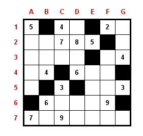 Da hier die schwarzen Felder angegeben werden müssen, wäre die Lösung in dem Beispiel B2, D3 und C4