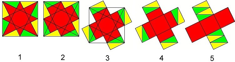 Zuerst färbt man die weißen Flächen gelb und grün ein wie in Abb. 1. Anschließend spiegelt man die grünen Dreiecke wie in Abb. 2. Nun spiegelt man die gelben Dreiecke und legt sie mit der längsten Seite an die grünen Dreiecke an (siehe Abb. 3). Im nächsten Schritt entfernt man alle Innenlinien der roten Figur und die Linien des großen Quadrats. (siehe Abb. 4). Zum Schluss verschiebt man die roten Rechtecksflächen, sodass drei gleich große Quadrate entstehen. Drei der insgesamt fünf Quadrate ergeben die Sternfigur, deswegen beträgt der Anteil der Sternfläche 3/5 = 60%.