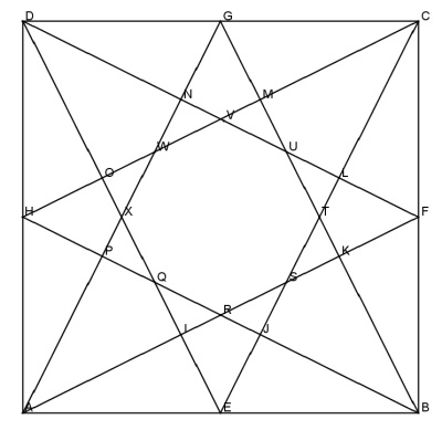 In einem Quadrat werden die Mittelpunkte einer Seite jeweils mit den gegenüberliegenden Ecken verbunden. Dadurch entsteht ein Stern mit 16 Ecken (siehe Zeichnung).