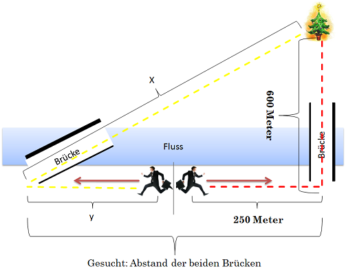Der eine (der rechte Läufer) biegt nach 250 Meter im rechten Winkel links auf eine Brück ein. Danach läuft er noch genau 600 Meter geradeaus und erreicht den Christbaum.